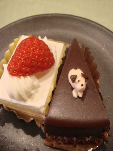 右のチョコレートケーキにワンコが乗ってる~!